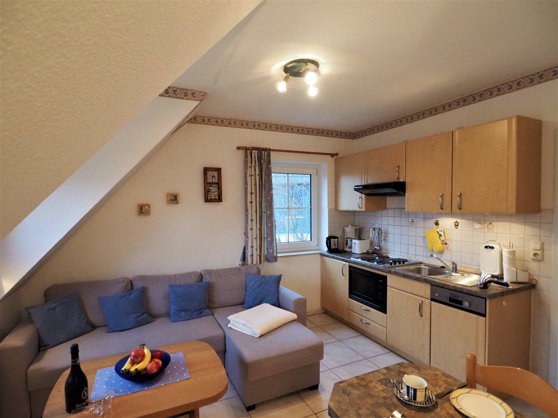 Die gut ausgestattete Küche besitzt unter anderem einen Kühlschrank, einen Herd und eine Spülmaschine.